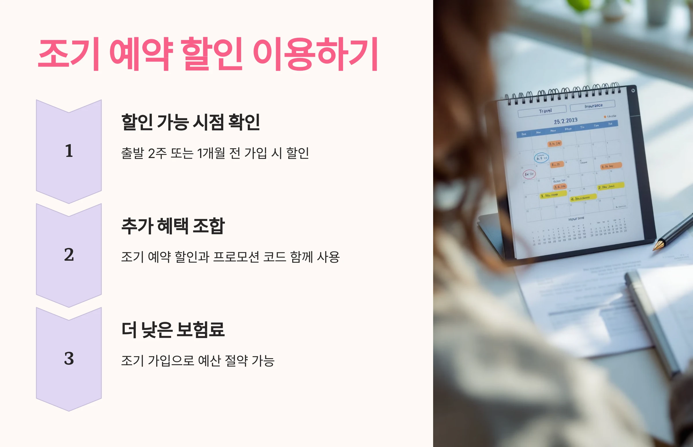 여행 일정이 확정되면 가능한 한 빨리 보험에 가입하여 조기 예약 할인을 받으세요. 할인 가능 시점 확인: 많은 보험사는 여행 출발 2주 전이나 1개월 전 가입 시 할인을 제공합니다. 추가 혜택 조합: 조기 예약 할인과 프로모션 코드를 함께 사용할 수 있는지 확인하세요. 더 낮은 보험료: 조기 가입자는 보험료가 낮아질 가능성이 높아, 예산을 절약할 수 있습니다. 여행 계획과 연계: 여행 일정에 따라 조기 예약 혜택이 적용되는 상품을 찾으세요. 미리 조건 검토: 조기 예약으로 가입한 상품의 보장 조건이 적합한지 반드시 확인하세요.