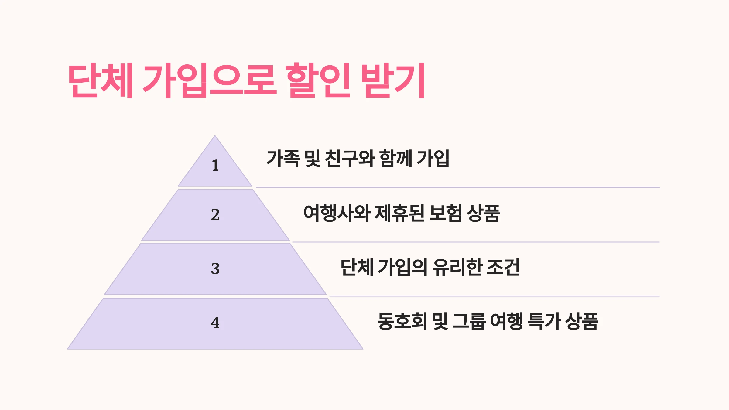 단체 여행은 추가 할인을 받을 수 있는 절호의 기회입니다. 가족 및 친구와 함께 가입: 가족 단위로 보험에 가입하면 가족 할인 혜택을 받을 수 있습니다. 여행사와 제휴된 보험 상품: 여행사를 통해 가입하면 할인된 가격으로 보험을 제공받는 경우가 많습니다. 단체 가입의 유리한 조건: 단체 가입은 개별 가입보다 보장 조건이 유리하며, 추가 혜택도 포함될 가능성이 높습니다. 동호회 및 그룹 여행 특가 상품: 단체 여행을 계획 중이라면 특가 상품을 적극 활용하세요. 별도의 요금제 확인: 단체 가입 전 보험사에서 제공하는 특별 요금제를 확인하면 추가 비용 절감이 가능합니다.