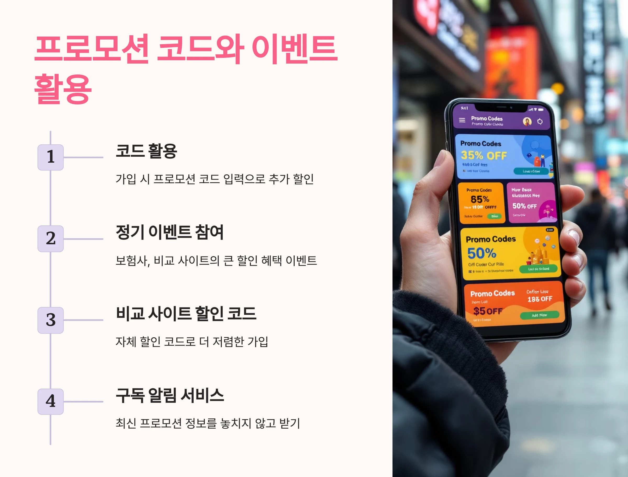 보험사에서 제공하는 프로모션 코드는 추가 할인을 받을 수 있는 좋은 방법입니다. 코드 활용: 가입 시 입력하는 프로모션 코드를 통해 추가 비용 절감을 누리세요. 정기 이벤트 참여: 보험사나 비교 사이트에서 진행하는 정기 이벤트는 큰 할인 혜택을 제공하므로 주기적으로 확인하세요. 비교 사이트 할인 코드: 비교 사이트는 자체적으로 할인 코드를 제공하며, 이를 통해 더 저렴하게 가입할 수 있습니다. 구독 알림 서비스: 보험사나 플랫폼의 구독 서비스를 이용하면 최신 프로모션 정보를 놓치지 않고 받을 수 있습니다. 코드 중복 적용 확인: 조기 예약 할인이나 단체 할인과 함께 프로모션 코드 적용이 가능한지 확인하면 추가 혜택을 받을 수 있습니다.