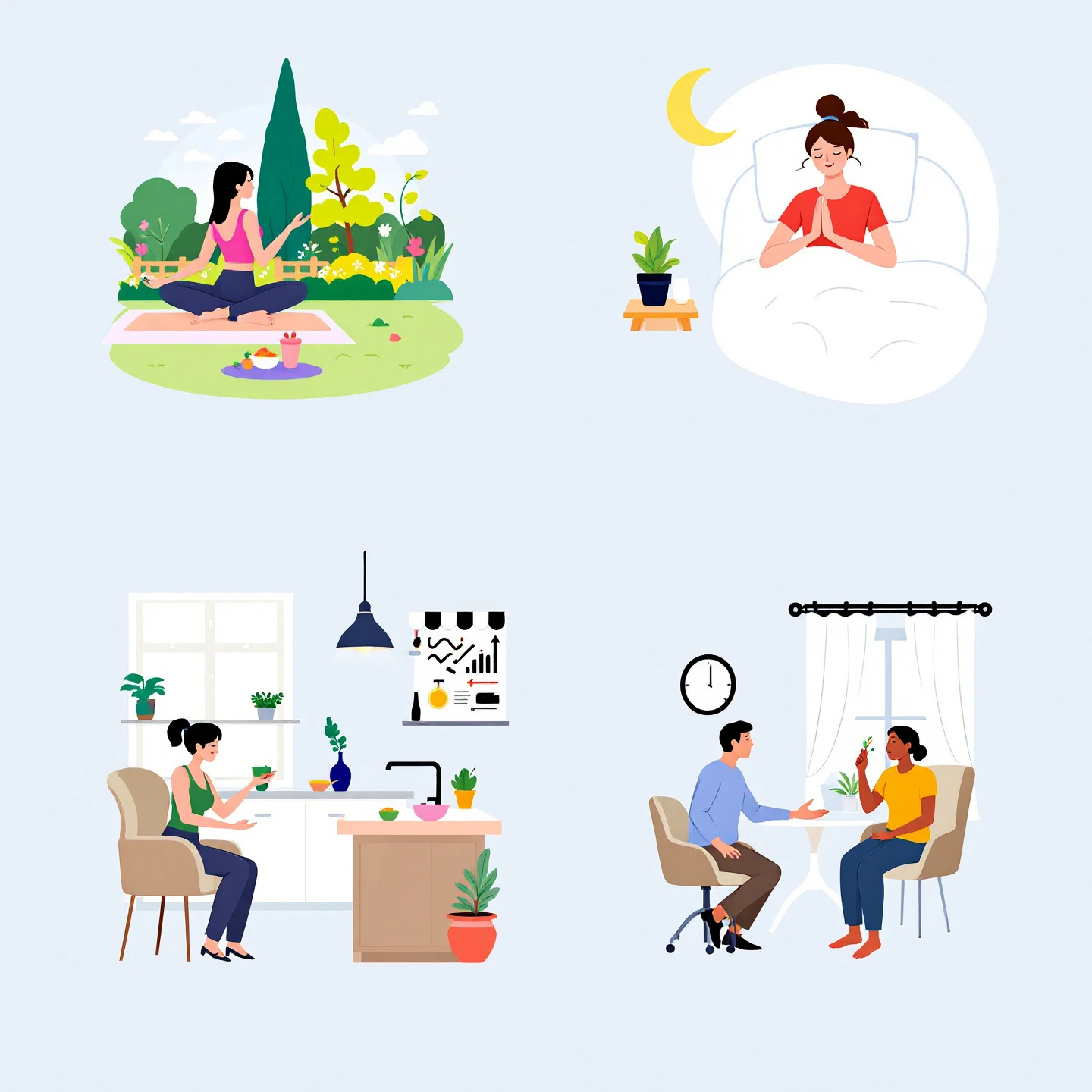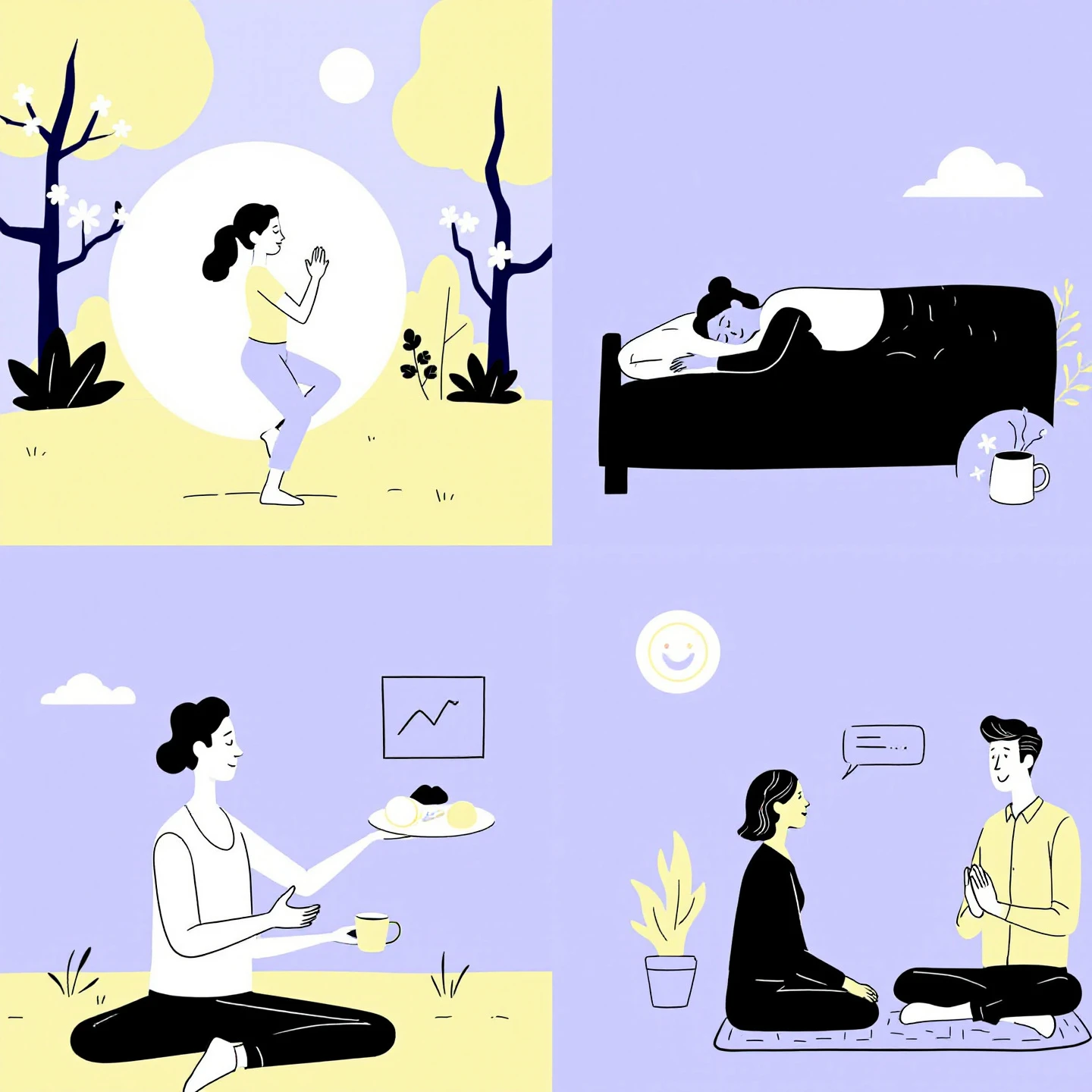 1. 명상과 운동 명상과 호흡 운동은 마음을 차분하게 하고 스트레스 호르몬 수치를 낮추는 데 도움을 줍니다. 하루 10~15분의 명상 시간을 가지세요. 규칙적인 유산소 운동은 신체적 건강뿐만 아니라 심리적 안정에도 긍정적인 영향을 미칩니다. 산책, 요가, 또는 가벼운 체조를 실천해 보세요.