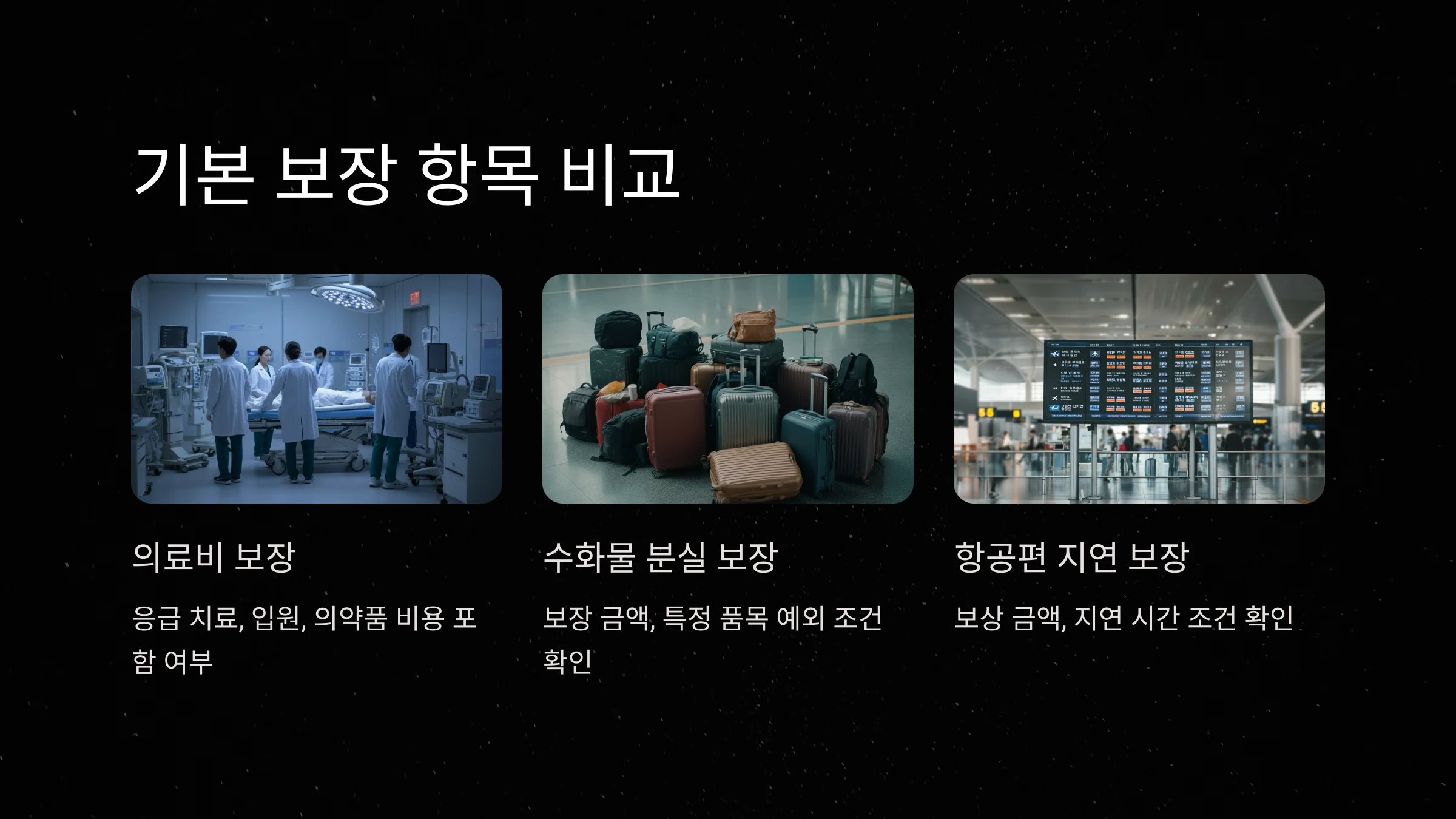 여러 보험 상품을 비교할 때, 비용 대비 보장 한도가 충분히 높은지 확인하세요. 보장 금액이 지나치게 낮은 상품은 실제 사고 발생 시 부족한 보상을 제공할 수 있습니다. 기본적인 의료비와 수하물 보장은 물론, 항공기 지연, 취소 등의 혜택이 포함된 상품을 선택하는 것이 바람직합니다.